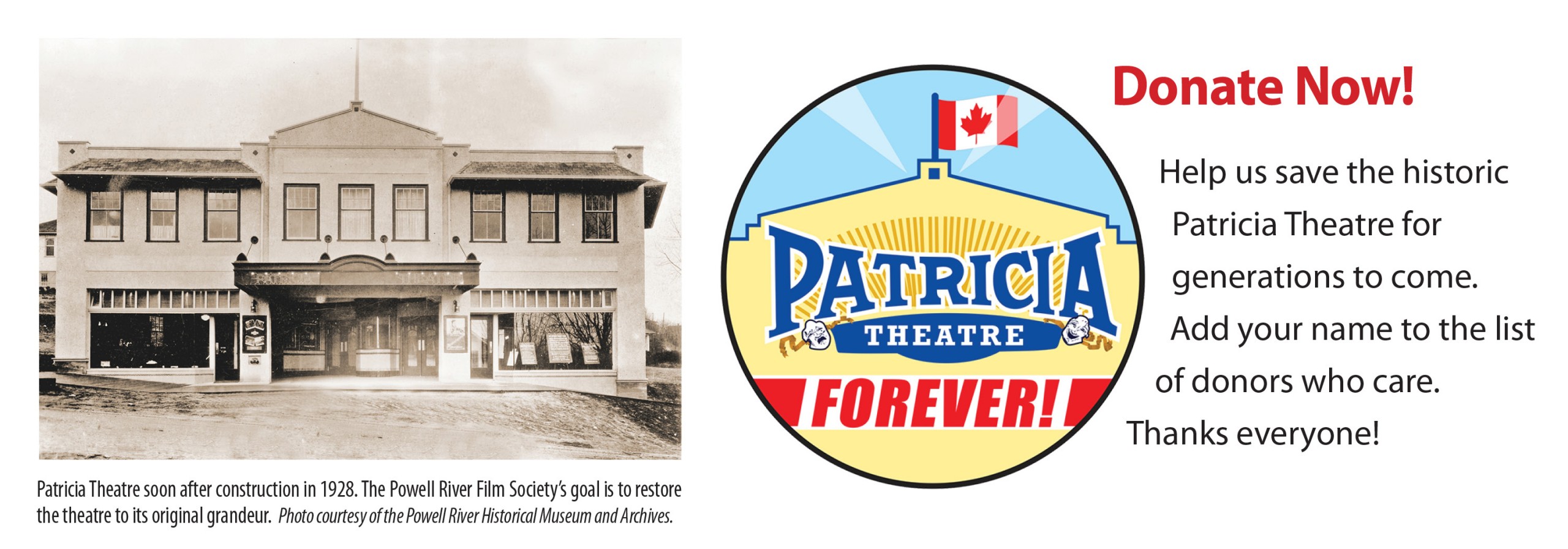Cheques made out to Powell River Film Society can be mailed or delivered care of the Patricia Theatre, 5848 Ash Avenue, Powell River, BC V8A 4R6